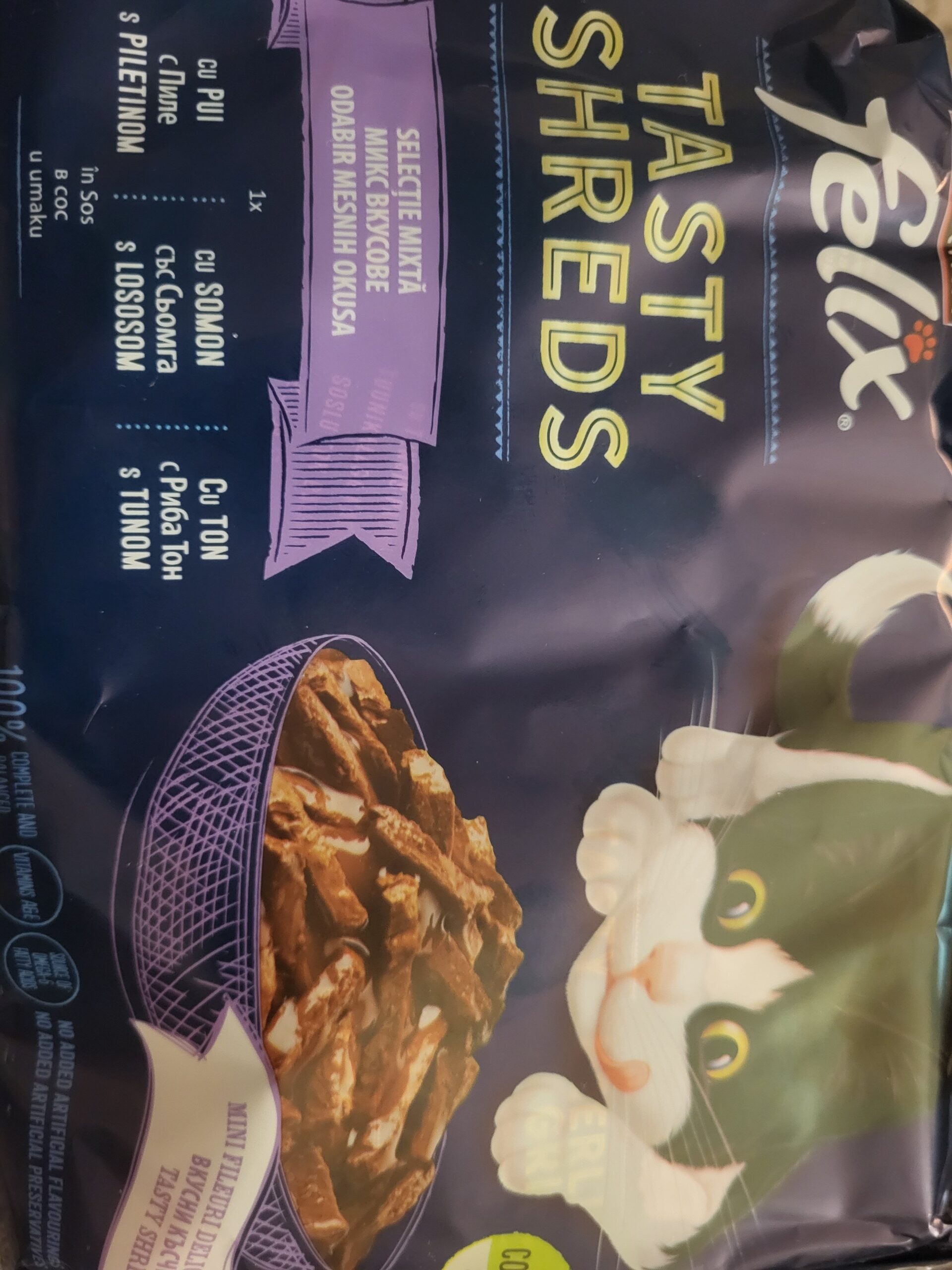 Meso i prerađevine životinjskog porekla/porijekla* (16%), ekstrakti biljnih proteina, riba i riblje prerađevine (tuna 4%), ulja i masti, različiti šećeri, minerali, prerađevine biljnog porekla/porijekla.