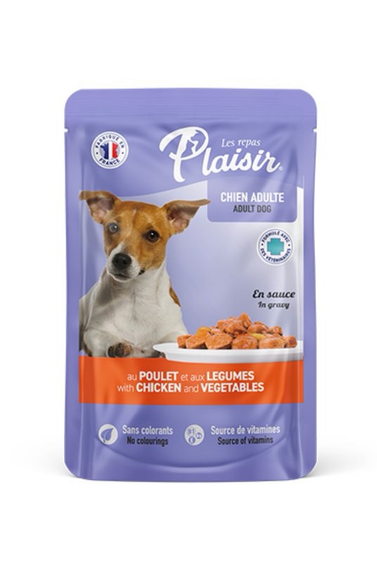 Plaisir hrana za odrasle pse, piletina i povrće u sosu, u kesici od 100 g.